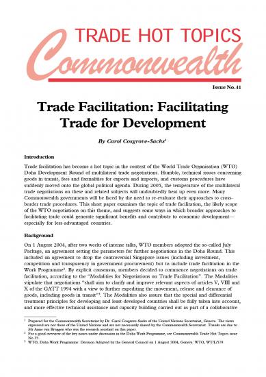 Trade facilitation has become a hot topic in the context of the World Trade Organization (WTO) Doha Development Round of multilateral trade negotiations. Humble, technical issues concerning goods in transit, fees and formalities for exports and imports, and customs procedures have suddenly moved onto the global political agenda. During 2005, the temperature of the multilateral trade negotiations on these and related subjects will undoubtedly heat up even more. Many Commonwealth governments will be faced by the need to re-evaluate their approaches to cross-border trade procedures. This issue of Trade Hot Topics examines the topic of trade facilitation, the likely scope of the WTO negotiations on this theme, and suggests some ways in which broader approaches to facilitating trade could generate significant benefits and contribute to economic development – especially for less-advantaged countries.
