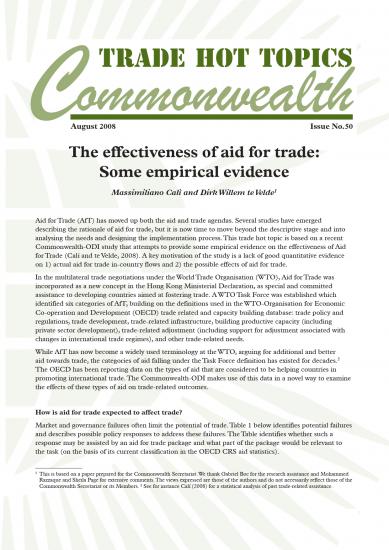 Aid for Trade (AfT) has moved up both the aid and trade agendas. Several studies have emerged describing the rationale of aid for trade, but it is now time to move beyond the descriptive stage and into analysing the needs and designing the implementation process. This issue of Trade Hot Topics provides a brief overview of empirical evidence on the effectiveness of Aid for Trade. A key motivation of the study is a lack of good quantitative evidence on actual aid for trade in-country flows and the possible effects of aid for trade.