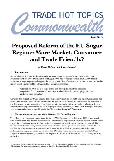 The European Commission has tabled proposals for the major reform and liberalisation of the EU Sugar Regime, starting in 2005, and for completion in 2008. A substantial reduction in sugar exports and support for exports, reduction of domestic price support and production are proposed. The current EU Sugar Regime has been fiercely criticised for not being market, consumer, and developing country trade friendly. This issue of Trade Hot Topics explores how friendly the reforms are, in particular to the developing country countries. It gives particular attention to the implications for the Sugar Protocol exporters within the ACP sugar producing countries, and the least developed countries with preferential access to the EU under the ‘Everything But Arms’ Agreement.