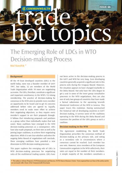 This issue of Commonwealth Trade Hot Topics explores the emerging role of least developed countries (LDCs) in World Trade Organization decision-making processes for negotiating rules of the multilateral trading system. The Trade Hot Topics series provides concise and informative analyses of various trade and trade-related issues which are prepared both by Commonwealth Secretariat and international experts. For further information on the work of the Commonwealth Secretariat on International Trade please click here