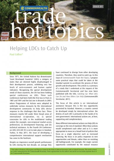 This issue of Commonwealth Trade Hot Topics entitled Helping LDCs to Catch Up - by Paul Collier - proposes some practical steps that could be considered in the upcoming Fourth United Nations Conference on Least Developed Countries (LDCs) to be held in Istanbul, Turkey, in May 2011 to accelerate the process of growth and development in the world’s poorest economies.