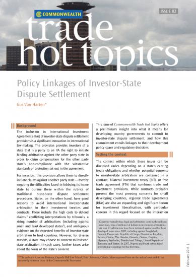 This issue of Commonwealth Trade Hot Topics offers a preliminary insight into what it means for developing country governments to commit to investor-state dispute settlement, and how this commitment entails linkages to their development policy space and regulatory decisions.