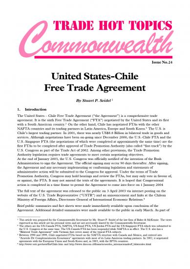 This issue of Trade Hot Topics examines the United States–Chile Free Trade Agreement (FTA). The Agreement is the sixth FTA negotiated by the United States and its first with a South American country. Chile has negotiated FTAs with the other NAFTA countries and its trading partners in Latin America, Europe and South Korea. This paper provides a brief history of the Agreement, a comparison with other US trade agreements and a chapter-by-chapter summary of terms.