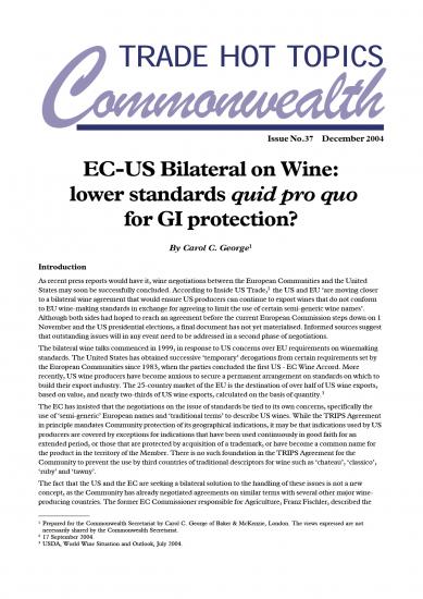This issue of Trade Hot Topics examines the wine negotiations between the European Communities and the United States. The bilateral wine talks commenced in 1999, in response to US concerns over EU requirements on winemaking standards. This paper considers the legal issues of the EU–US negotiations, looking specifically at EC oenological standards and the WTO rules, geographical indications and traditional terms, and WTO rules and bilateral arrangements.