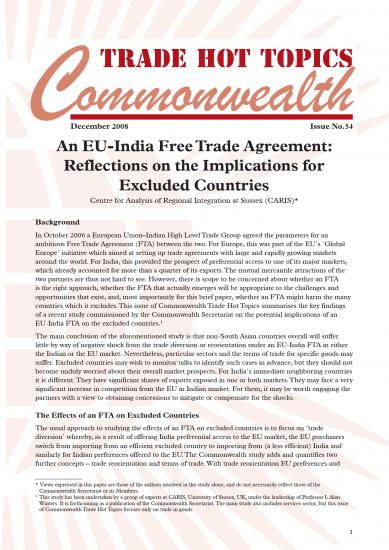 In October 2006 a European Union–Indian High Level Trade Group agreed the parameters for an ambitious Free Trade Agreement (FTA) between the two. For Europe, this was part of the EU’s ‘Global Europe’ initiative which aimed at setting up trade agreements with large and rapidly growing markets around the world. For India, this provided the prospect of preferential access to one of its major markets, which already accounted for more than a quarter of its exports. The mutual mercantile attractions of the two partners are thus not hard to see. However, there is scope to be concerned about whether an FTA is the right approach, whether the FTA that actually emerges will be appropriate to the challenges and opportunities that exist, and, most importantly, whether an FTA might harm the many countries which it excludes. This issue of Commonwealth Trade Hot Topics summarises the key findings of a recent study commissioned by the Commonwealth Secretariat on the potential implications of an EU–India FTA on the excluded countries.