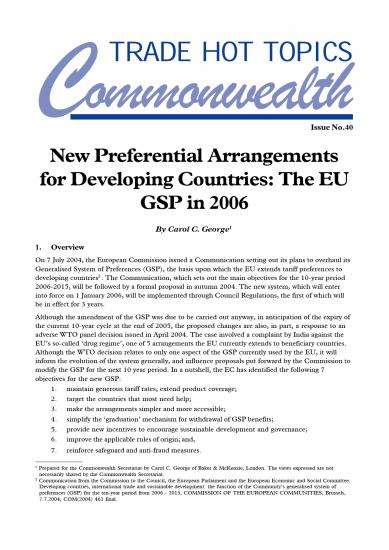 On 7 July 2004, the European Commission issued a Communication setting out its plans to overhaul its Generalised System of Preferences (GSP), the basis upon which the EU extends tariff preferences to developing countries. The Communication, which sets out the main objectives for the 10-year period 2006–2015, will be followed by a formal proposal in autumn 2004. The new system, which will enter into force on 1 January 2006, will be implemented through Council Regulations, the first of which will be in effect for 3 years. This issue of Trade Hot Topics explains the origins of the GSP and examines what the new GSP purports to do.