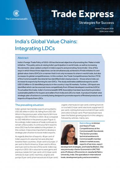 India’s Foreign Trade Policy of 2015–20 has the broad objective of promoting the ‘Make in India’ initiative. This policy aims at raising India’s participation in world trade, as well as increasing the domestic value-added content in India’s exports and promoting ‘brand India’. One of the ways in which these three objectives can be simultaneously achieved is if India initiates its own global value chains (GVCs) in a manner that it not only increases its share in world trade, but also increases its global competitiveness. In this context, the Trade Competitiveness Section (TCS) of the Commonwealth Secretariat has identified India’s lead products – those where India can increase its exports by forming its own GVCs. The study estimates additional exports worth USD 23 billion in 35 identified products in the country’s top 50 markets. Further, 129 inputs are identified which can be sourced more competitively from 20 least developed countries (LDCs). To actualise this trade, India’s Commonwealth SME Association has been launched to provide a sustainable platform for buyers and sellers from India and LDCs to meet. A product/market-wise strategic plan of actions is currently being designed to promote exports of finished products and imports of inputs from LDCs.